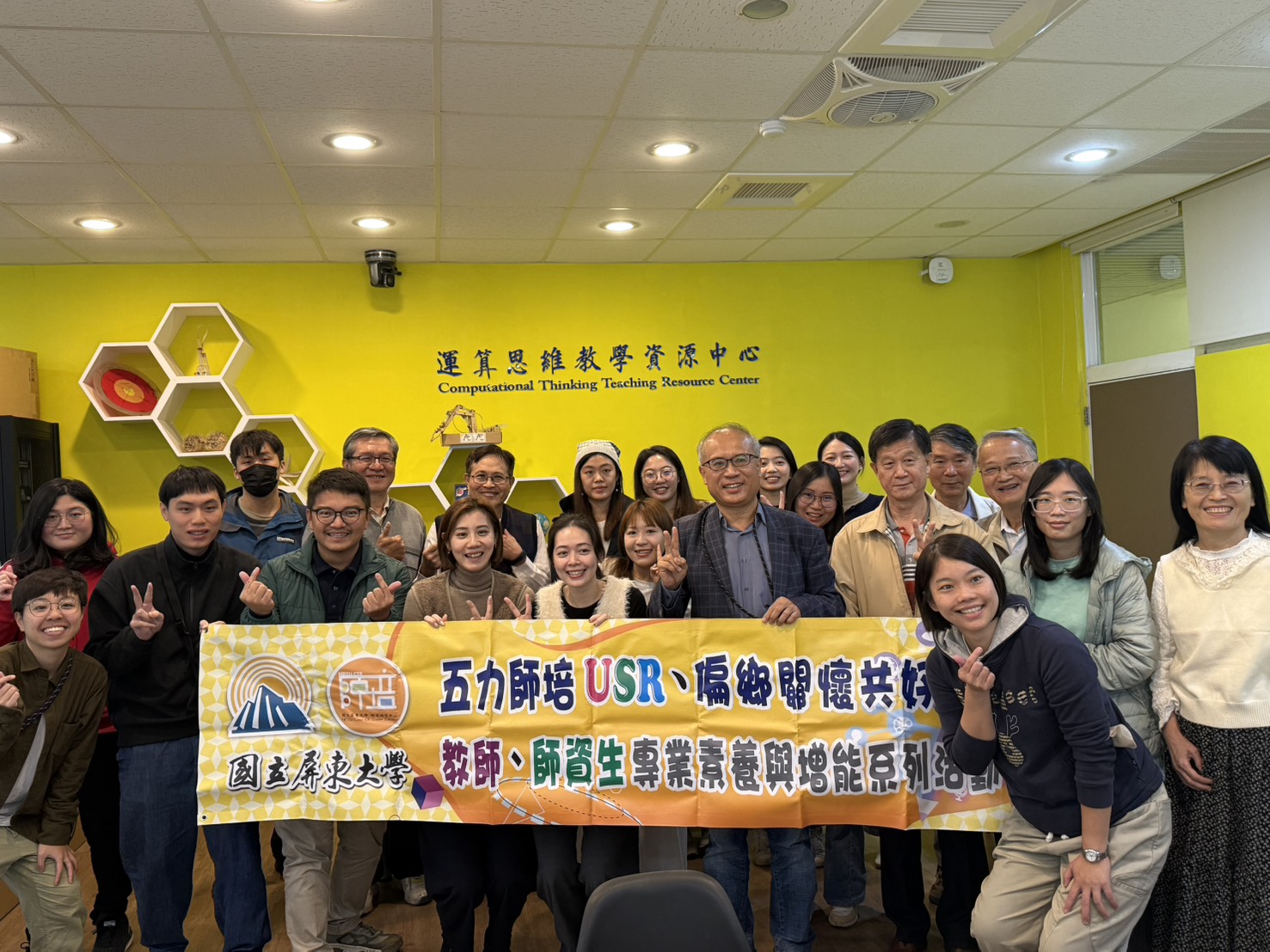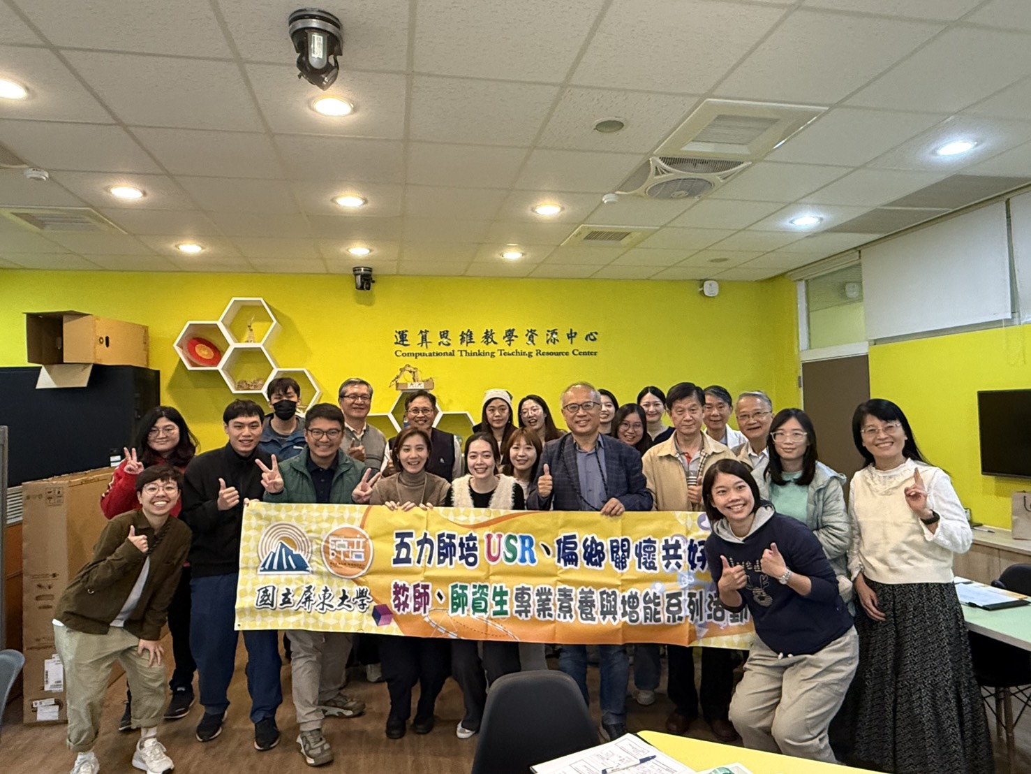 邀請國立屏東科技大學工作犬訓練中心羅書姍老師舉辦「與毛孩一起解憂」工作坊。由講師設計一系列的動物輔助活動,參與者藉由與超萌又專業的工作犬互動、簡單指令訓練、撫摸與陪伴等體驗,感受療癒氛圍,達到放鬆與紓壓的效果。讓大家在溫暖的交流中獲得身心支持,也為教學與學習注入新能量。