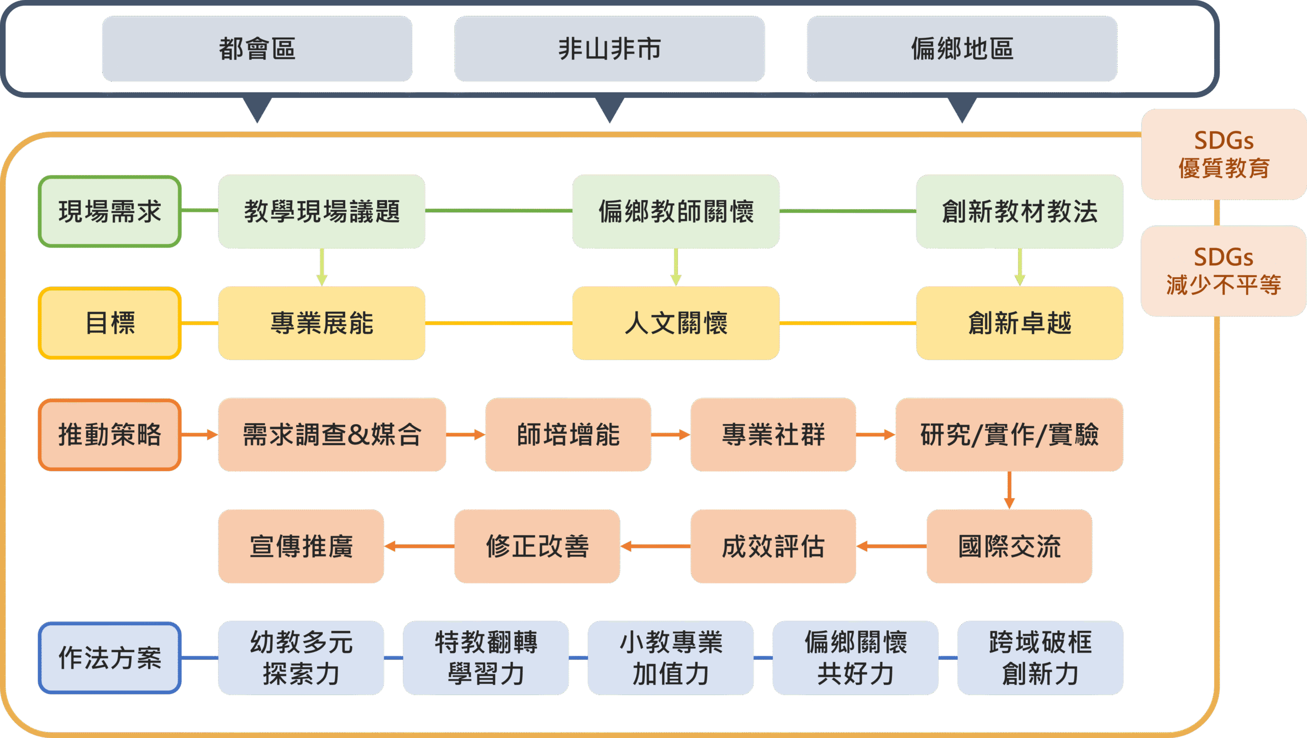 針對「偏鄉/特偏需求」,如偏鄉教師流動、小校混齡教學等,規劃子計畫「偏鄉關懷共好力」,提供偏鄉學校關懷及支持,一起共好,面對困難。