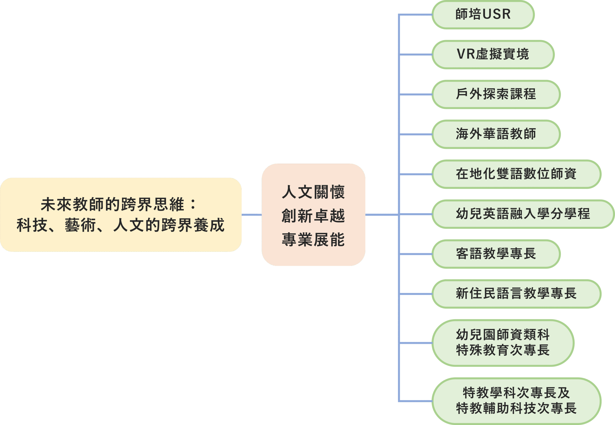(1)師培USR;(2)VR虛擬實境;(3)戶外探索課程;(4)海外華語師資;(5)在地化雙語數位師資;(6)幼兒英語融入學分學程;(7)客語教學專長;(8)新住民語言教學專長;(9)幼兒園師資類科特殊教育次專長;(10)特教學科次專長及特教輔助科技專長。