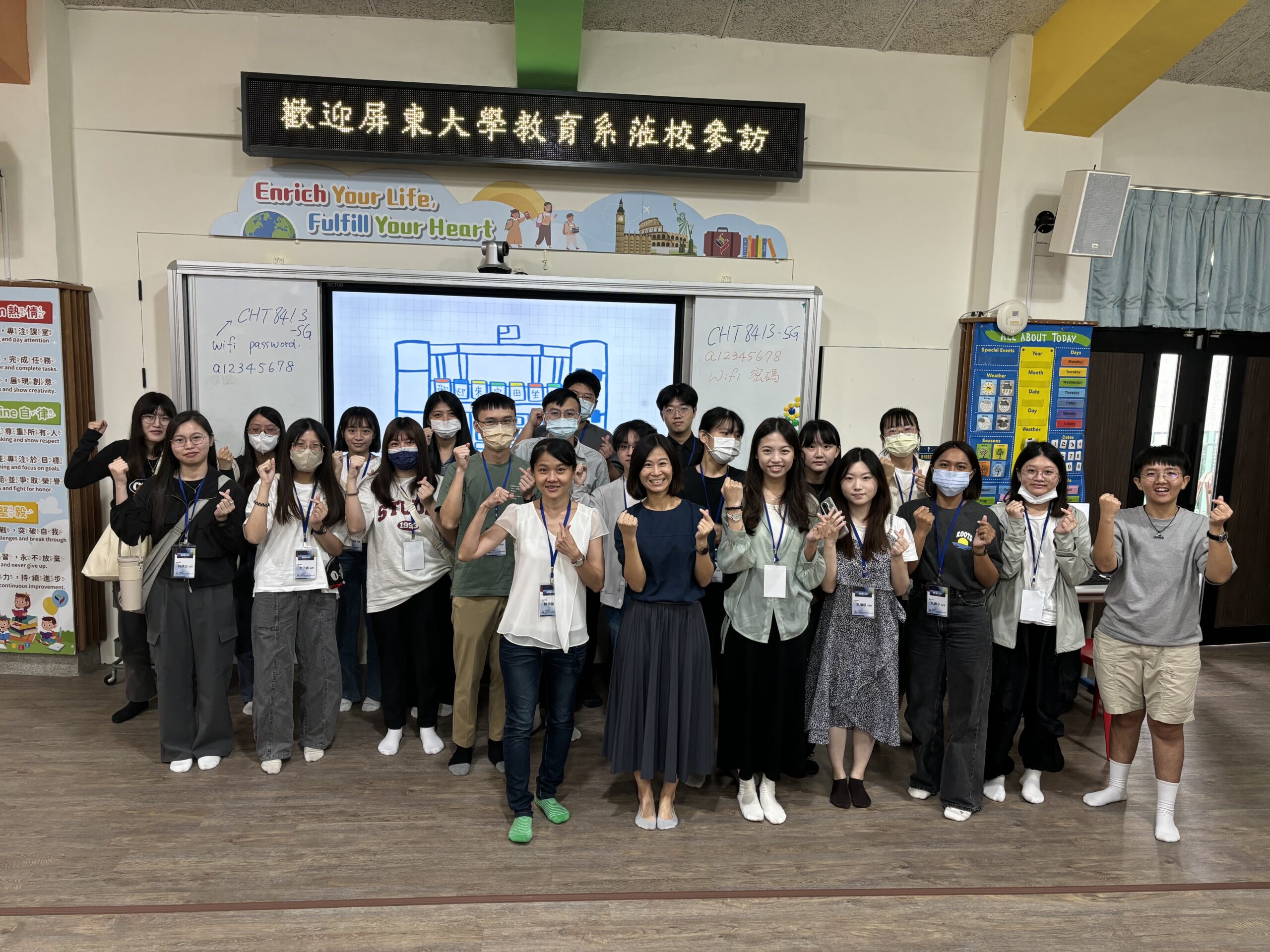 師資生至屏東內埔鄉富田國小辦理雙語教育實驗學校觀摩暨跨校交流活動,聆聽富田國小團隊分享轉型為實驗學校的歷程、融合KIST雙語課程內容與教室佈置及SEL實驗課程執行的困難與挑戰。