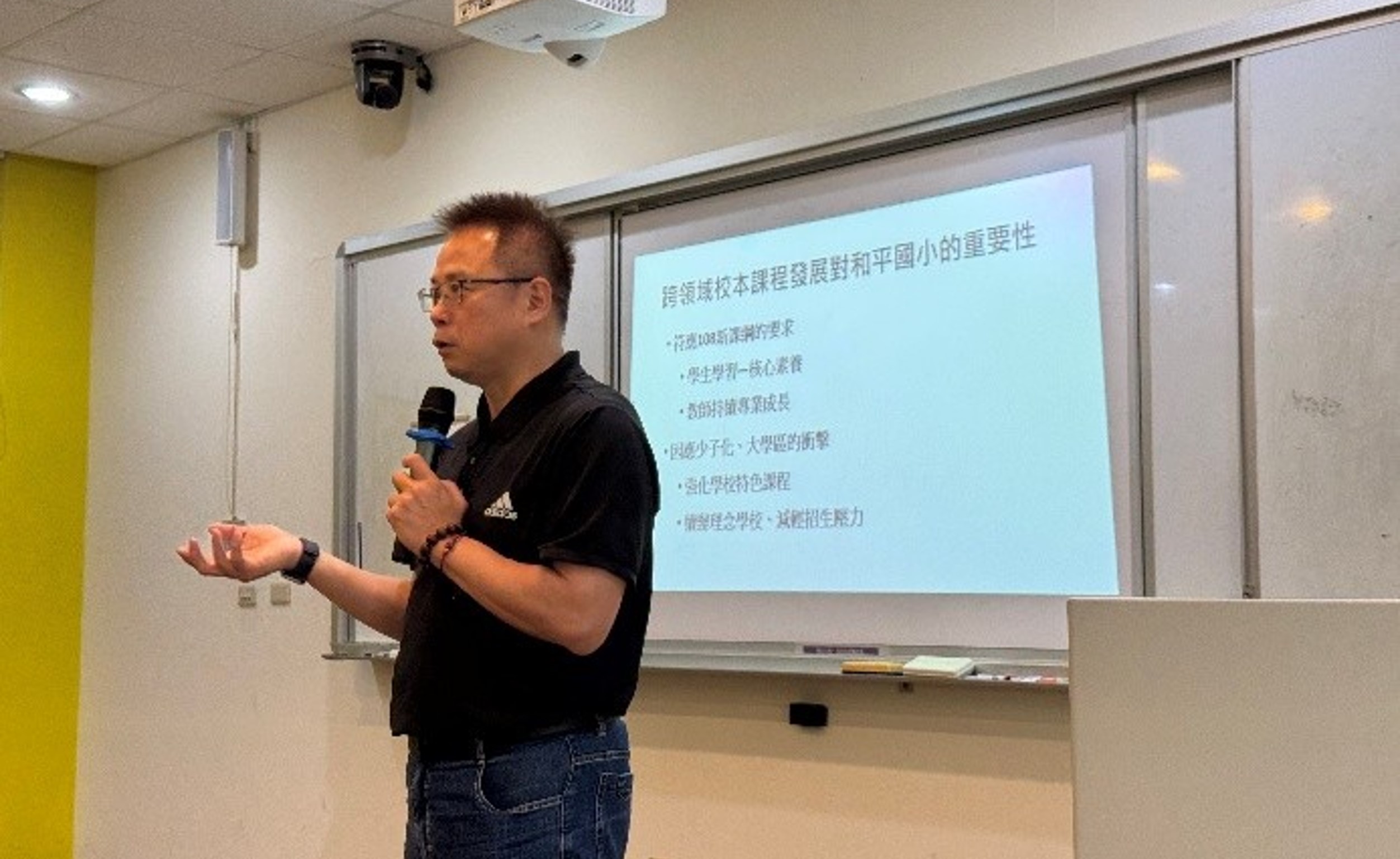 邀請屏東和平國小吳子宏校長辦理「跨領域理念課程之發展與設計」協同教學活動,分享擔任作為領導者如何協助教師團隊進行跨領域課程設計,引導學生學習團隊合作與教案撰寫策略。
