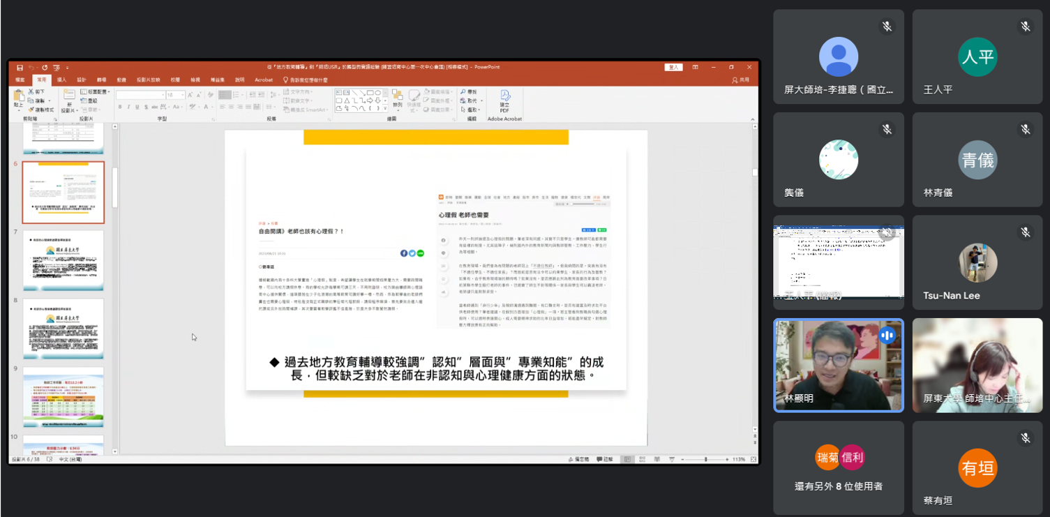 召開「師資培育中心-教師專業成長」社群活動,由林顯明助理教授分享「從『地方教育輔導』到『師培USR』的轉型與實踐經驗」,引導社群教師共同參與「師培USR」教師陪伴與支持,或其他不同方面之計畫工作,增強本校與高級中等以下各級學校之鍊結。