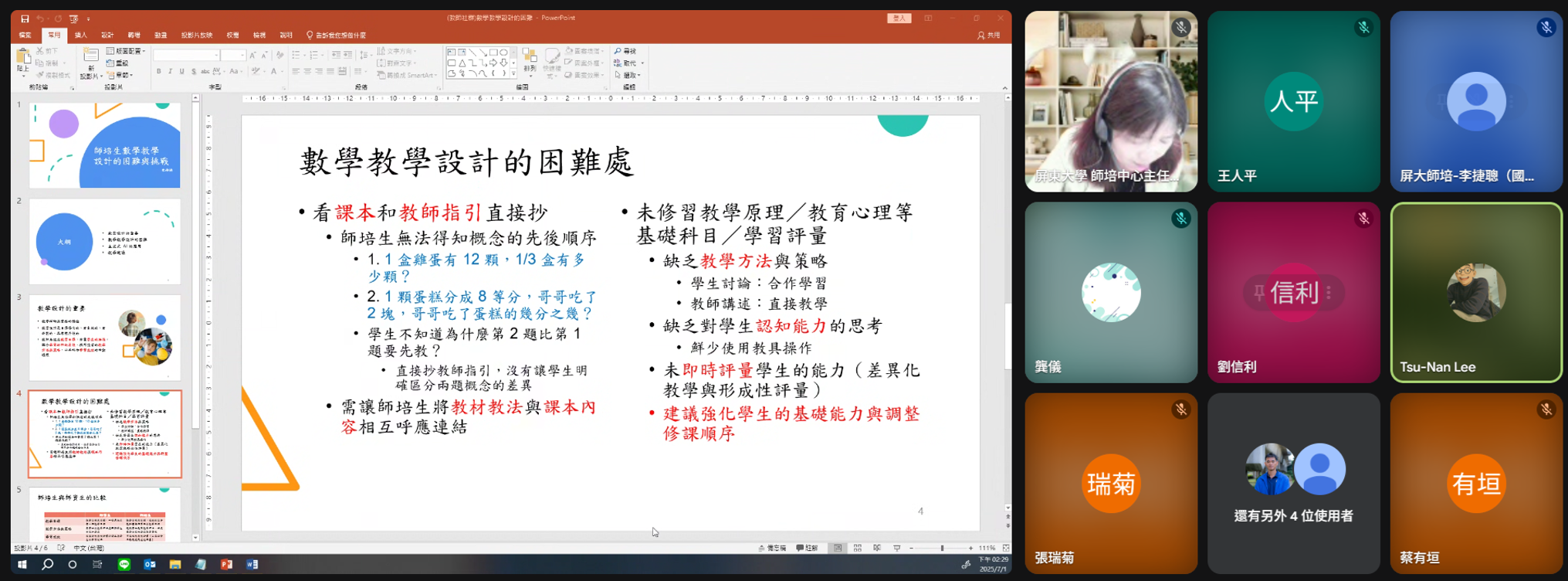 教師專業成長社群活動:「師培生數學教學設計的困難與挑戰」講座,藉由數學教學歷程與經驗,引領師資生與教師們分享數學教學設計的困難及需調整處,並提供結合生成式AI於數學教育課程的應用與建議。
