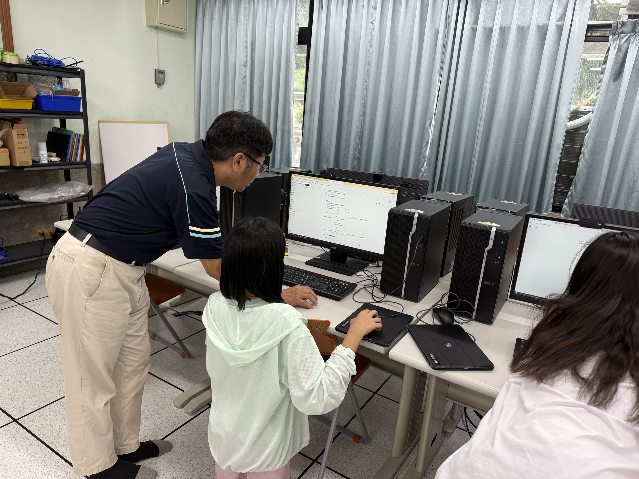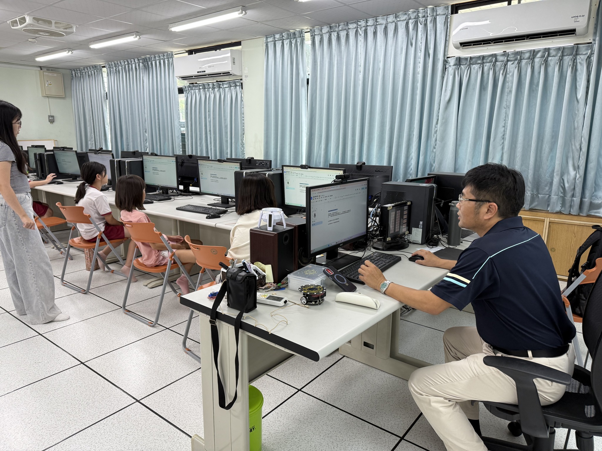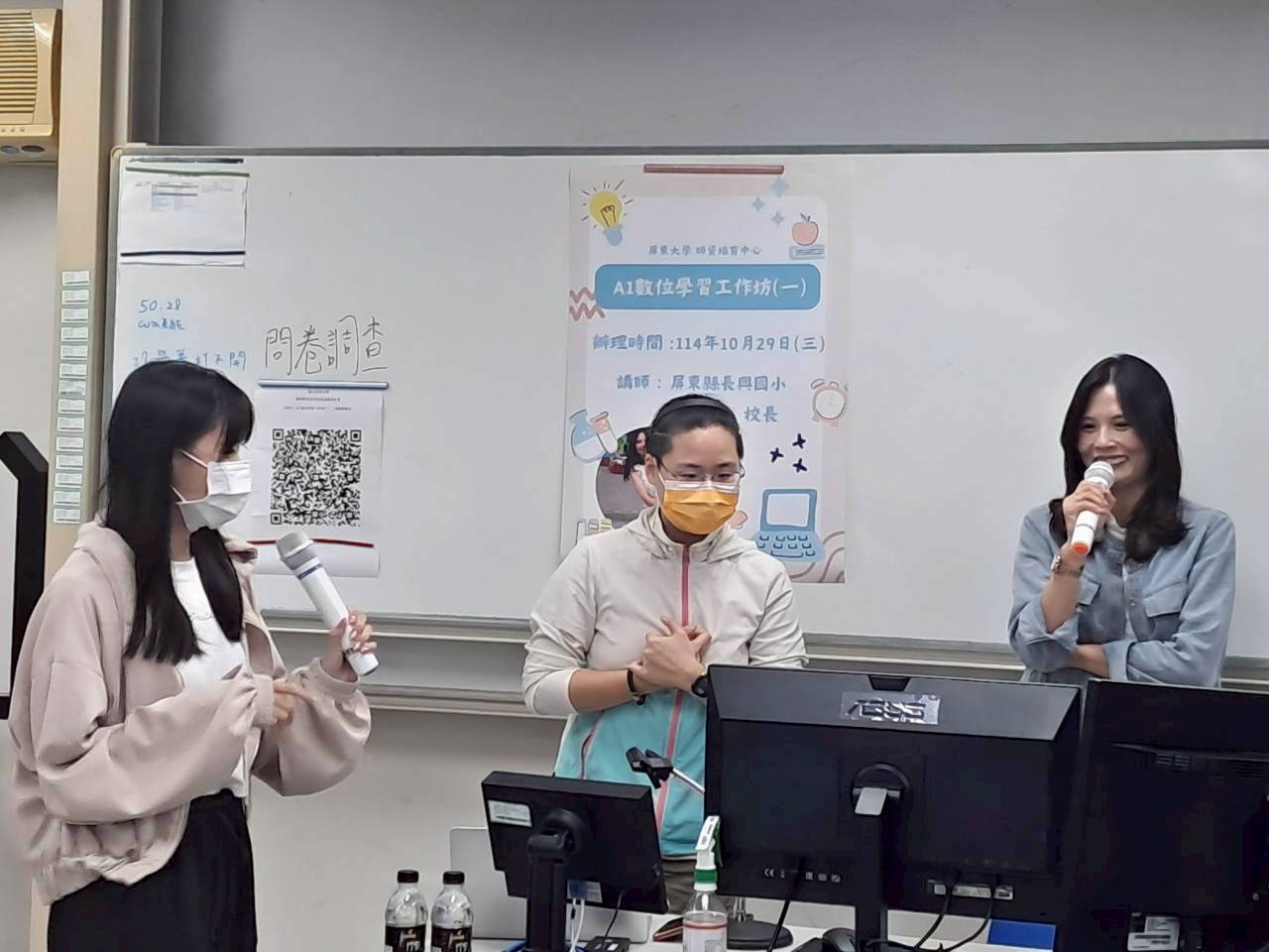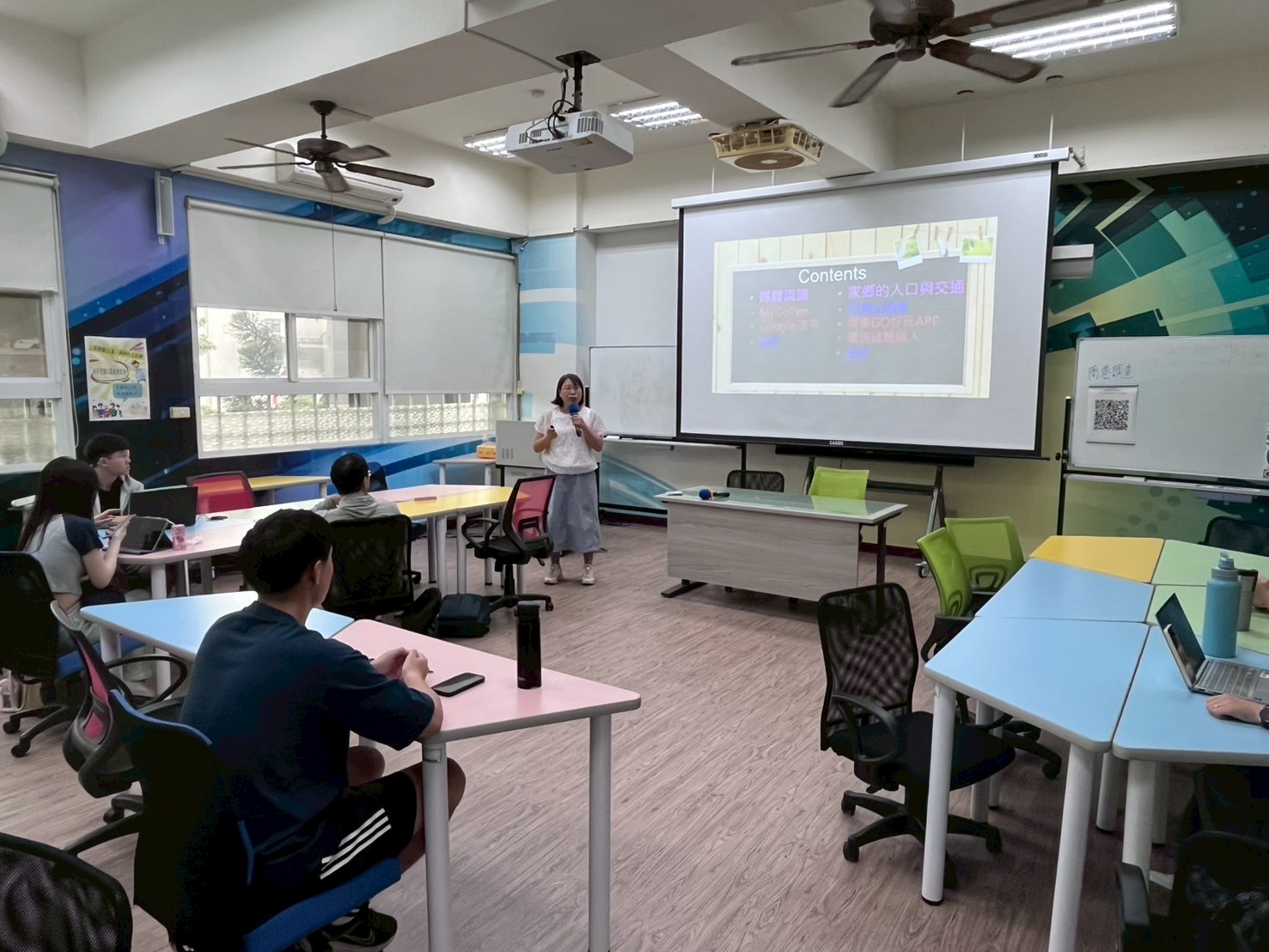 楊志強副教授帶領學生進行「自我主題介紹設計」課程。學生以自身感興趣的主題為內容,運用ChatGPT生成相關圖片,並於另一間教室錄製配音,將聲音與影像整合成完整影片後上傳至YouTube。隨後,學生將圖片與影片QR Code製作成主題卡片。課程中,老師訪問多位學生的學習感想,學生普遍表示語音輸入與AI工具讓創作變得更有趣且具成就感。最後依據學習表現進行評分並頒發小禮物,氣氛熱絡。