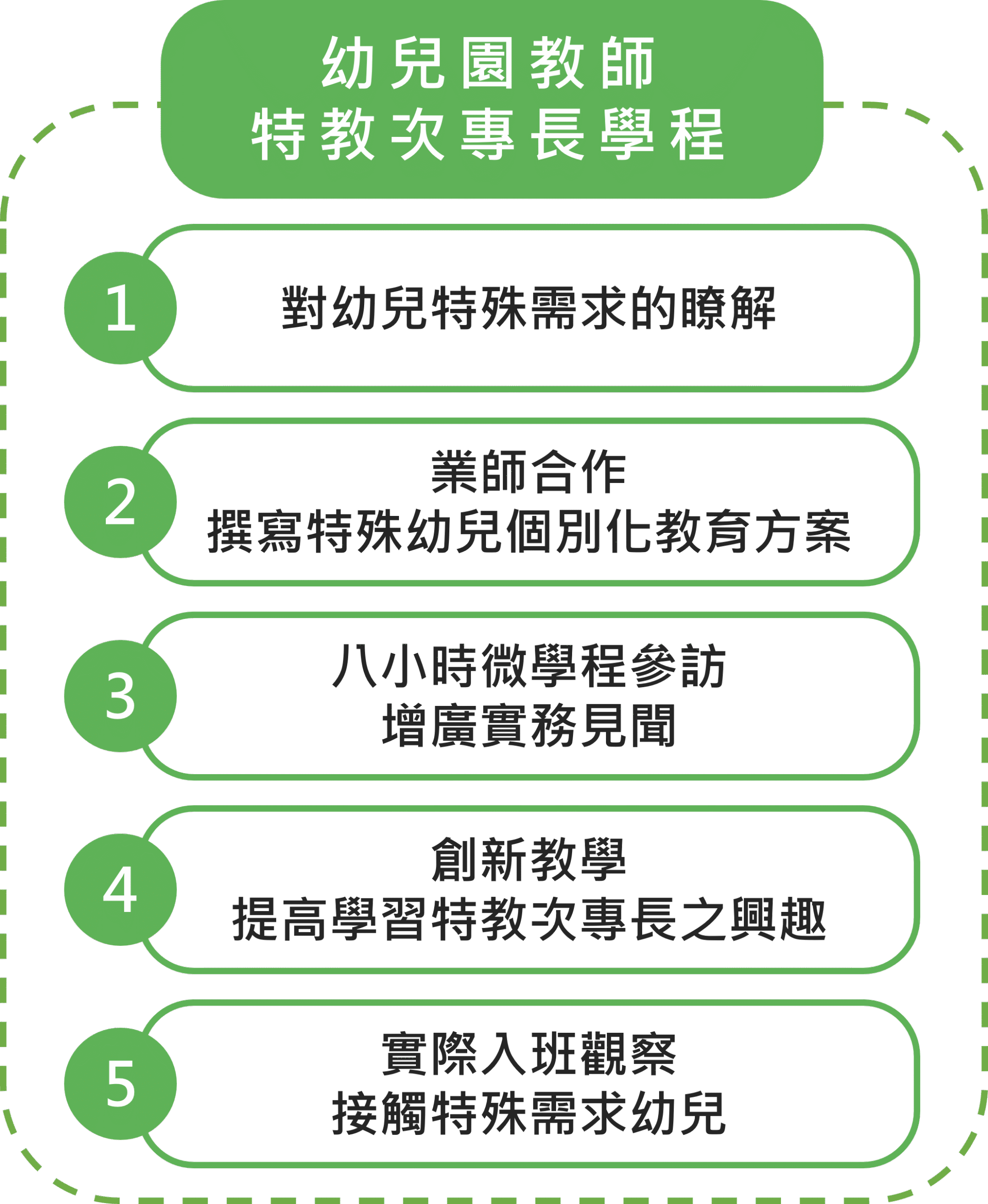 幼兒園師資類科特殊教育次專長 發展特色背景 CRPD 臺灣於2014年與聯合國簽訂《身心障礙者權利公約》(Convention on the Rights of Persons with Disabilities, CRPD),使CRPD國內法化。且公布身心障礙者權利公約施行法,強調CRPD八大原則,分別為「尊重他人,尊重他人自己做的決定」、「不歧視」、「充分融入社會」、「尊重每個人不同之處,接受身心障礙者是人類多元性的一種」、「機會均等」、「無障礙」、「男女平等」及「尊重兒童」,保障身心障礙兒童的權利。CRPD的國內法化,促使特殊教育法進行修法,讓融合教育和零拒絕的觀念向下延伸到學前教育。 社會推動 社會認知幼教領域中融合教育越來越重要,幼教師除了對於一般幼童發展的知識之外,也應具備如何支持特殊需求孩子的能力。研究已證明良好的早期特殊教育支持能有效促進幼兒整體成長。因此,培養幼兒園師資生具備特殊教育次專長不僅可以確保所有幼兒接受到平等有質量的教育機會,還可以為需要更多關心和關注的特殊需求孩子提供強有力的支持。本校幼兒教育學系在民國109年向教育部申請了幼兒園教師特教次專長學程,現已實施2年,這幾年發展出的特色包括:(1)培養幼教師資生對學生特殊需求幼兒的瞭解(2)與業師合作,實際撰寫特殊幼兒個別化教育方案(3)八小時微學程參訪,增廣實務見聞(4)創新教學,提高師資生學習特教次專長之興趣(5)跟隨巡迴輔導教師入班觀察,實際接觸特殊需求幼兒。 協助幼教師資生瞭解學前融合教育的班級經營實務。 提供幼教師資生實際接觸學前特殊需求幼兒之機會。 提升幼教師資生對特教的學習興趣。 預期目標 協助幼教師資生瞭解教學現場可能遇到的狀況。 提供幼教師資生瞭解不同國家回應特殊幼兒教育之政策及教學方式。 執行內容 專業特教團隊 結合具有特教專業背景的教育人員,建立專業的特教團隊,以提供幼兒園特殊需求孩子的專業支援。可行策略包括: 1.業師分享:業師分享學前融合教育班級經營實務。2.與巡輔老師一同入班見習:巡輔老師提供幼教師資生實際接觸學前特殊需求幼兒之機會。 多元創新的特幼課程 規劃特殊需求幼兒的學習內容和方法,設計多元的特教課程,提升幼教師資生對特教的學習興趣,同時讓幼兒有效的學習與成長。規劃的創新課程包括: 1.問題導向學習(Play & Program based learning, PBL):打造虛擬問題解決教學情境,協助幼教師資生瞭解教學現場可能遇到的狀況。2.科技融入教學:結合生生用平板的教育政策,打造科技融入特幼教學的學習環境。 見習、參訪與實習機會 提供修課學生透過見習、參訪與實習,實際接觸特殊需求幼兒,並為其設計個別化教育方案課程之實作機會。讓學生實際教學,更好地理解和應用特教知識。 了解更多 在地化雙語數位師資即戰力 幼兒英語融入學分學程 客語教學專長 新住民語言教學專長 幼兒園師資類科 特殊教育次專長 特教學科次專長 特教輔助科技次專長 計畫主持人 活動成果